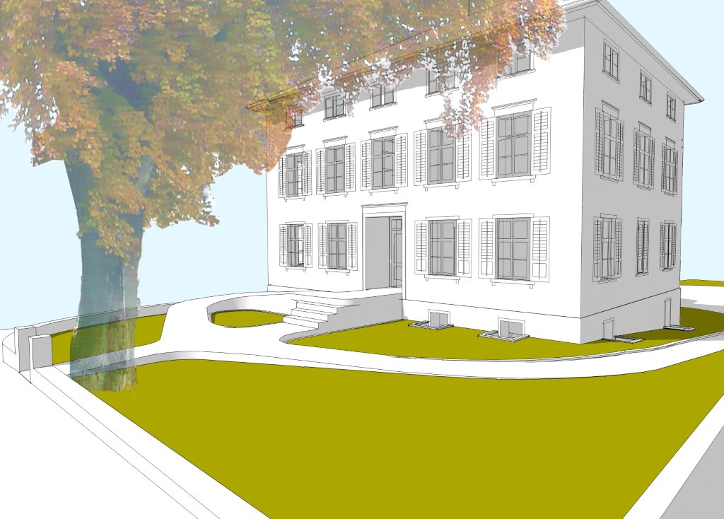 Zur Restaurierung des denkmalgeschützten Gebäudes gehörten die stark strapazierte Fassade, die Sandsteineinfassungen der Fenster sowie die Klappläden. Diese wurden in Zusammenarbeit mit dem Amt für Denkmalpflege saniert. Sämtliche Fenster wurden gemäss den Richtlinien der Denkmalpflege ersetzt. Die Dacheindeckung blieb bestehen, der Blitzschutz wurde mit einer originellen Musiknote erneuert.